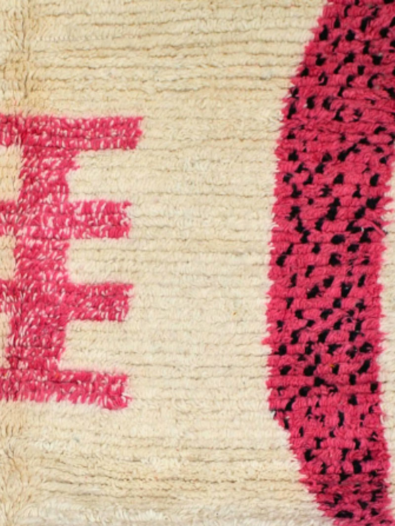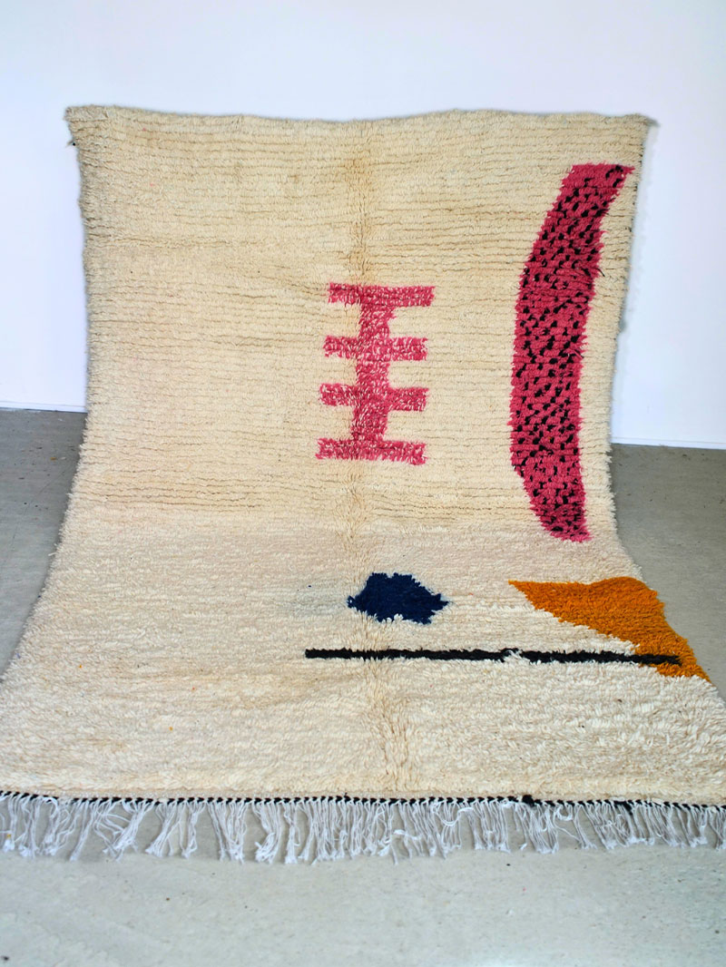 Ce tapis fabriqué dans la région d’Azilal est une création exclusive pour Maison KenzOumi. Les motifs combinant figures géométriques et symboles berbères, ainsi que le choix de couleurs vives font de ce modèle une authentique œuvre artistique. Presque comme une toile de Miro. Ce modèle mesure 155X240 cm.