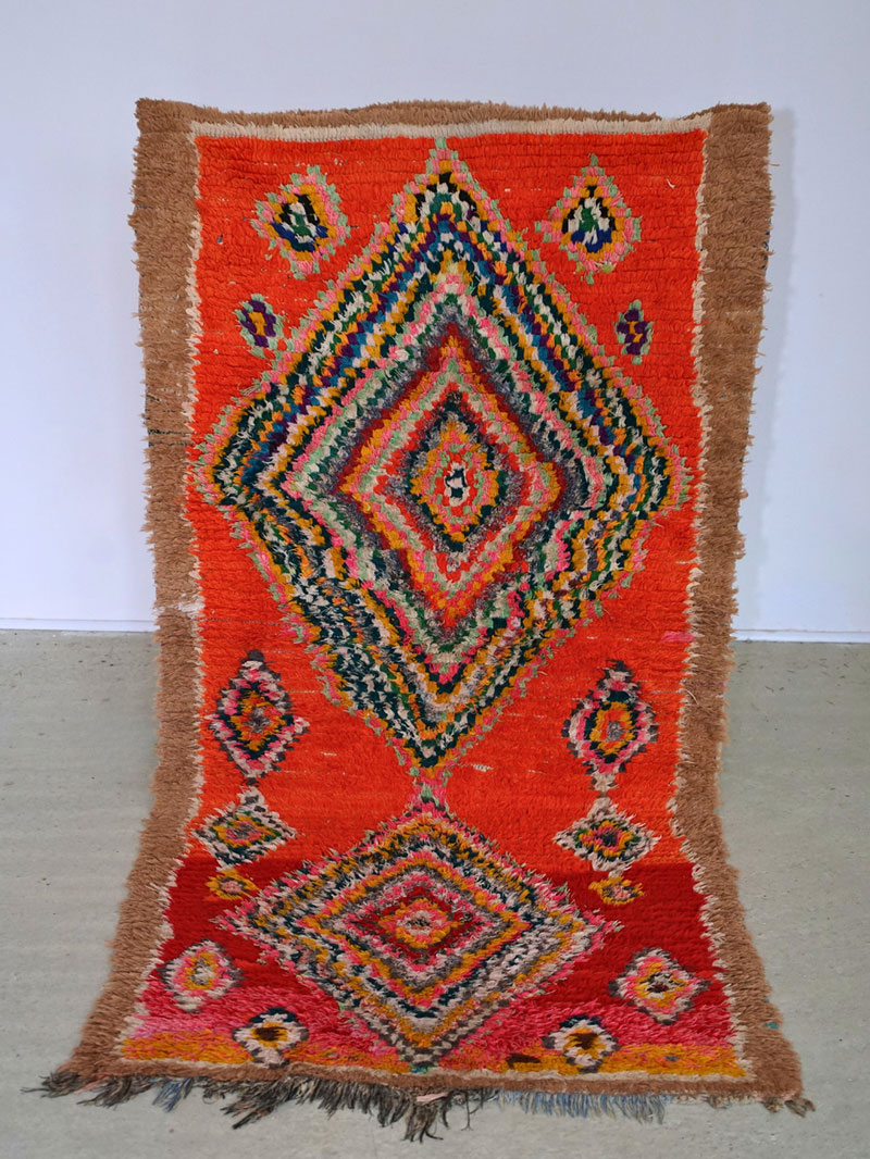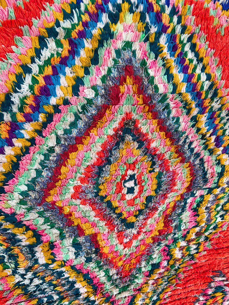 Ce tapis fabriqué dans la région d’Azilal est une création exclusive pour Maison KenzOumi. C’est un de nos modèles chouchoux ! Les motifs combinant figures géométriques, symboles berbères et couleurs vives font de ce modèle une authentique œuvre issue de la culture berbère. La dimension tribale donne à cette création artistique un mystère qui retrace toute l’histoire du Maroc. Ce modèle mesure 165X260 cm.